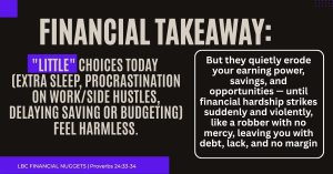 Financial Takeaway: “Little” choices today (extra sleep, procrastination on work/side hustles, delaying saving or budgeting) feel harmless. But they quietly erode your earning power, savings, and opportunities — until financial